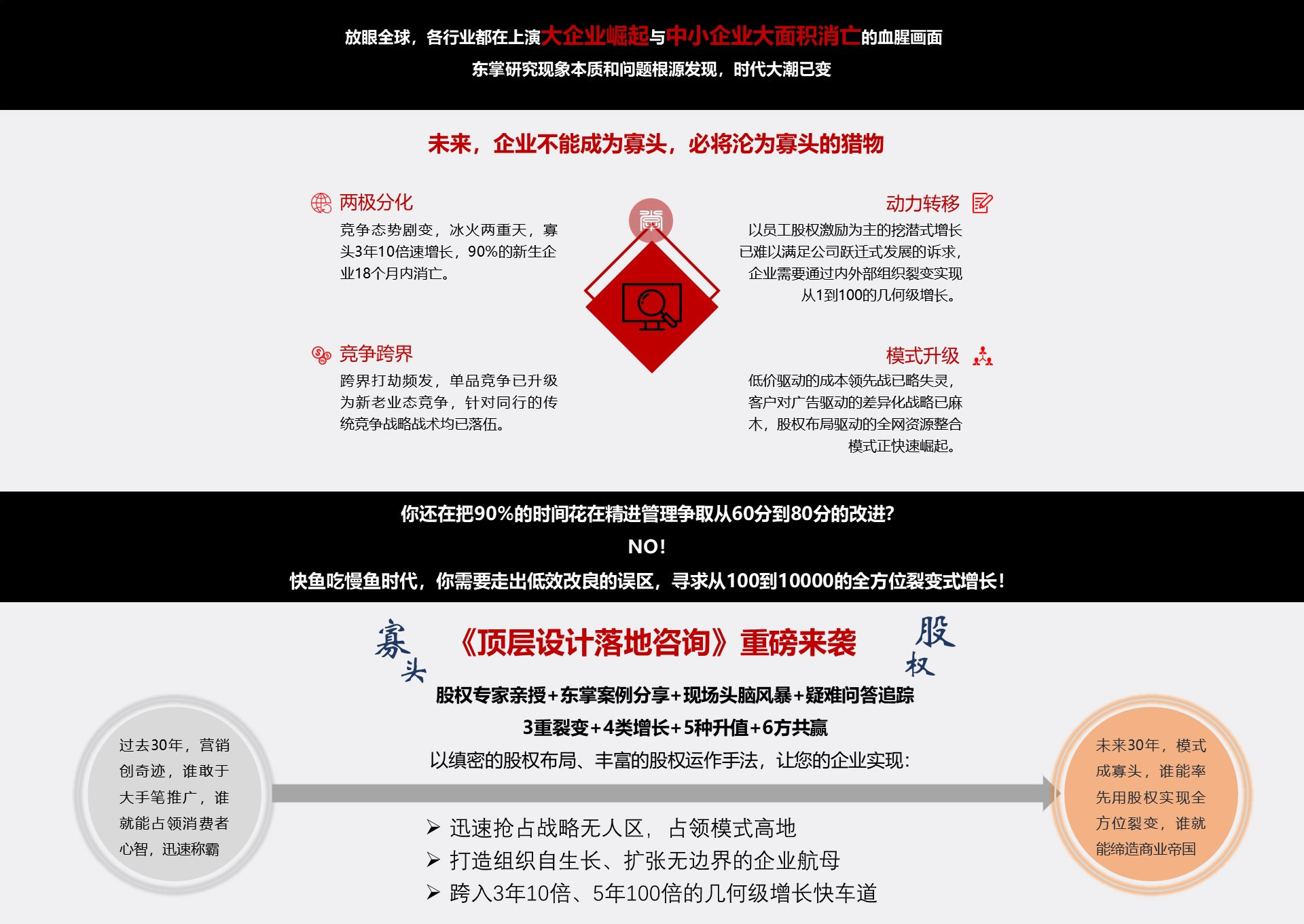 崛起:通过动态股权机制,东掌咨询帮助企业逐步构建起利益共同体、事业共同体、命运共同体,打造产业帝国