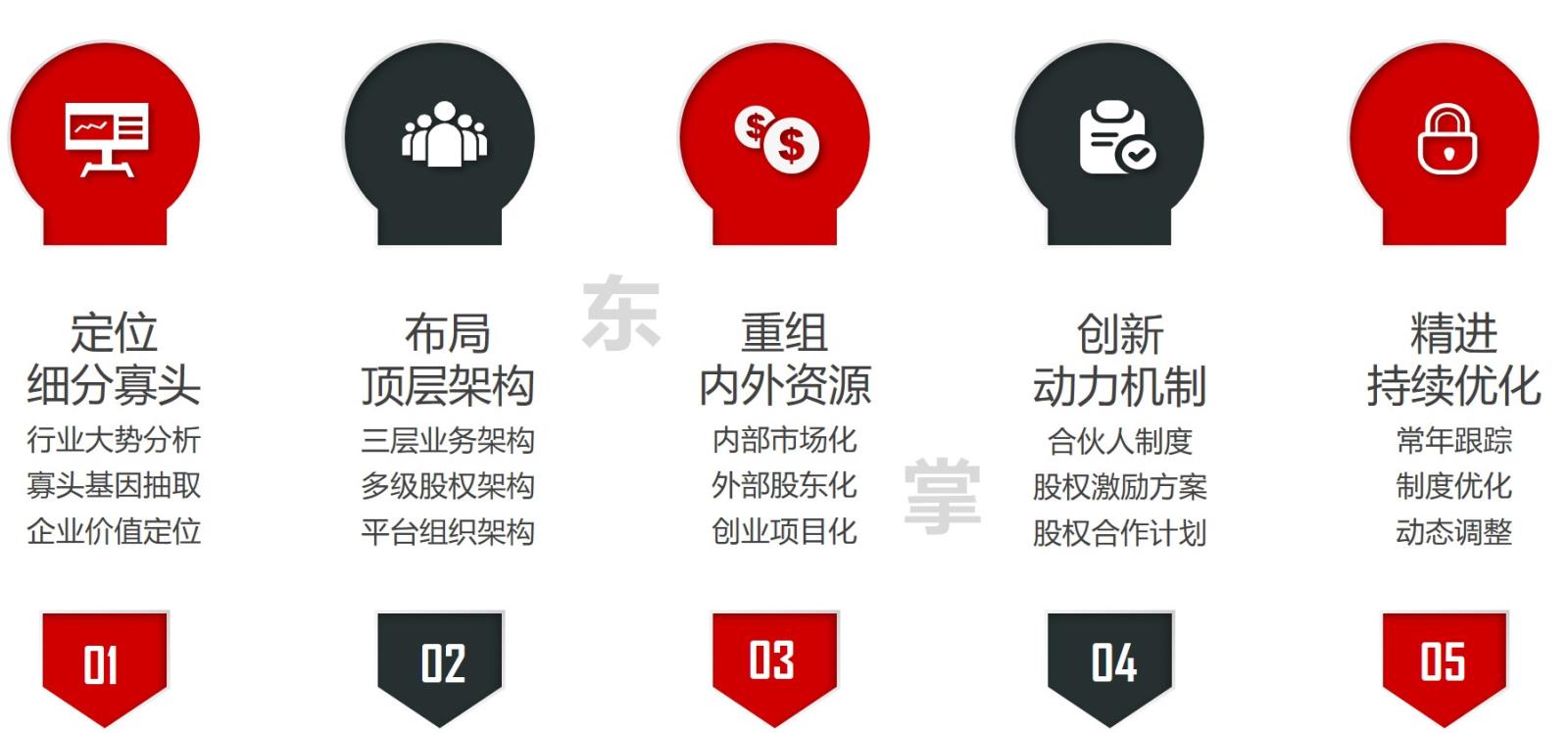 商业模式:经济新常态下,资产增值速度放缓,传统的重资产运营模式面临现金流紧张、资产运用效率低下、扩张速度受限等难题。东掌顶层设计咨询,帮助企业运用股权机制进行资源整合,实现从重资产运营向轻资产运营转变。